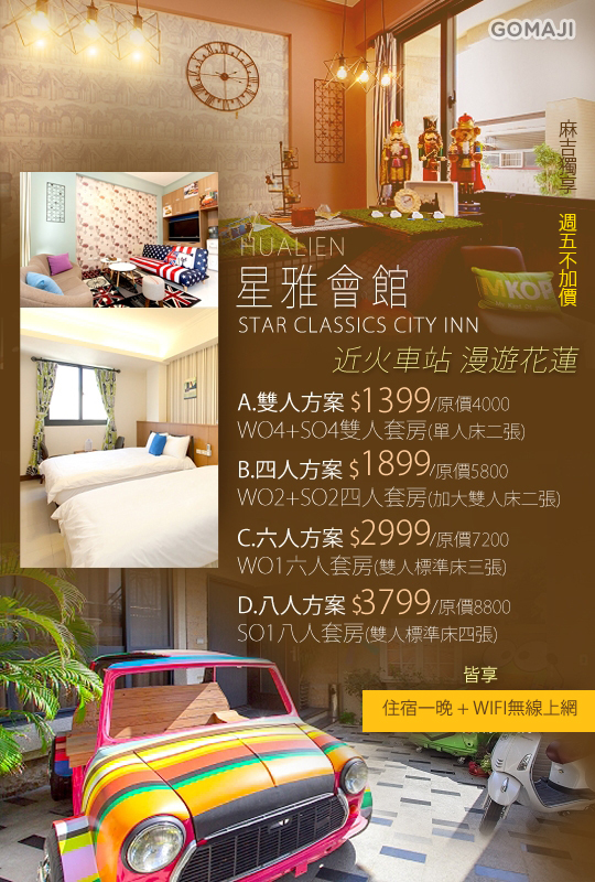 只要1399元起,即可享有【花蓮-星雅會館】近火車站漫遊花蓮A.雙人/B.四人/C.六人/D.八人專案〈含A.Wo4+So4雙人套房(單人床二張)/B.Wo2+So2四人套房(加大雙人床二張)/C.Wo1六人套房(雙人標準床三張)/D.So1八人套房(雙人標準床四張)住宿一晚 + WIFI無線上網〉麻吉獨享:週五不加價